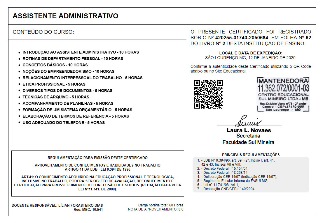 BASE LEGAL DO CERTIFICADO: TODOS OS CERTIFICADOS EMITIDOS SEGUEM A BASE LEGAL DA LDB Nº 9.394/96, ART. 39, § 2°, INCISO I, ART. 41, 42 E 43, INCISOS VII E VIII E DECRETO Nº 8.268/14 E A DELIBERAÇÃO CEE 14/97 (INDICAÇÃO CEE 14/97).